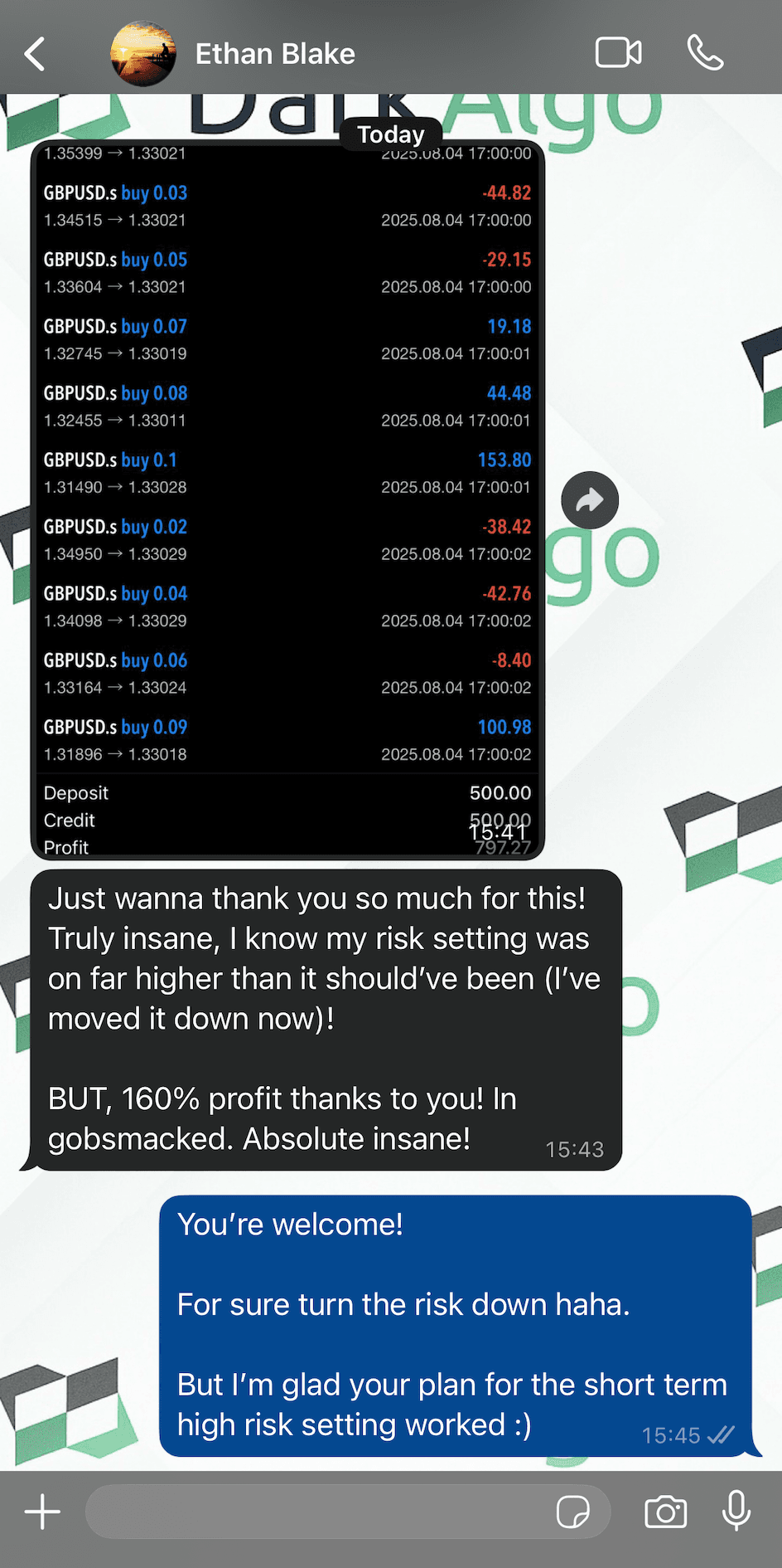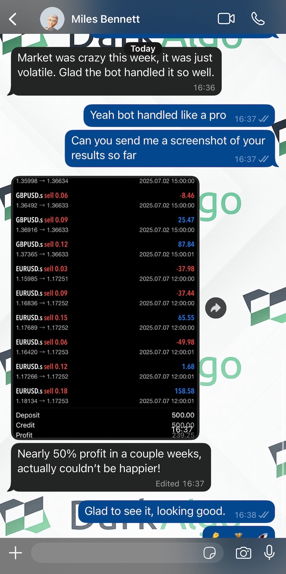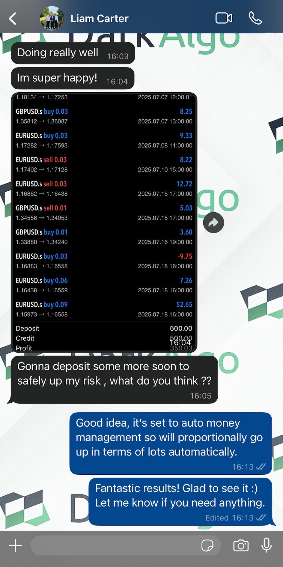 Connect with our team through WhatsApp for a personal consultation. We'll answer your questions about Dark Algo EA, discuss your trading goals, and explain how our system can help you achieve consistent returns without constant monitoring.